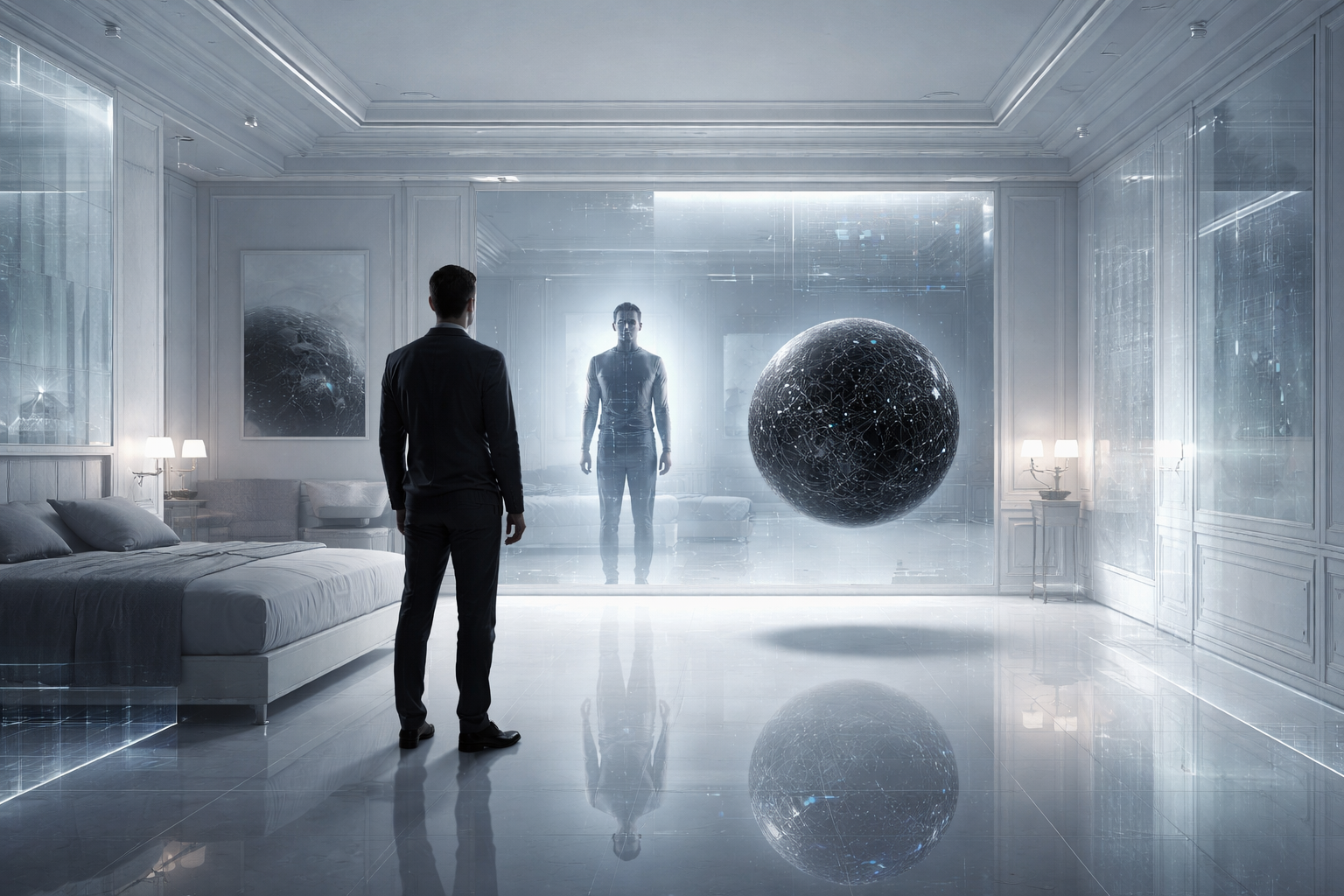 Perhaps it is not the great elevation, but the new form of the human being that becomes plausible in this environment: the human as profile, as prediction, as digital twin, who no longer just lives, but is constantly being computed. A being that no longer experiences the world as a shared outside, but as a curated inner surface. That sounds bleak – but it does not necessarily have to be. For Kubrick’s image also contains an ambivalence: transformation can be progress. But it depends on who builds the room and for what.